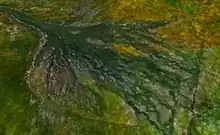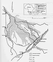 The Okavango inland delta, near Maun, receives an enormous amount of river inflow from Angola. Hence, the fan is so large and flat that it is rather called a delta. It takes six months for the peak inflow at the apex to reach the base of the delta.[4]