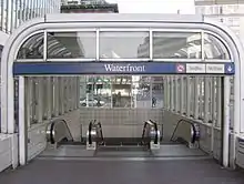 Waterfront station was one of the first stations to receive TransLink's "T" signage, denoting a transit station.[6] This signage was originally installed in the downtown core of Vancouver to help visitors during the 2010 Olympics.