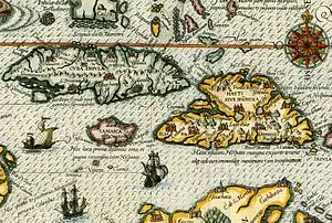 At sunset on 18 July, Newport's Little John and John Evangelist sighted three Spanish merchantmen off Cayo Jutias (west of Havana and north of Los Órganos).[15] They proved to be stragglers from Commodore Rodrigo de Rada's convoy from Veracruz, which had entered the Cuban capital five days earlier.[17] The English attacked in the darkness and opened fire compelling one ship to reverse course. The following morning the English closed in on the remaining pair: the 150-ton Nuestra Señora del Rosario captained by Miguel de Acosta and a 60-ton pinnace Nuestra Señora de la Victoria under Juan de Borda.[7] The Spaniards had lashed both vessels together, and a long-range artillery exchange commenced which the English got the better of, severely damaging Victoria.[3] The English then closed amidships with the Victoria and managed to board her and ferocious hand-to-hand combat soon followed.[5] Newport killed the Spanish captain in the melee that followed but soon after his right arm was struck off by another Spaniard trying to protect his captain.[6] However Newport was saved by a sergeant-at-arms who killed his would be assailant.[15] The Spanish were soon driven from the vessel and the English suffered five killed and sixteen wounded (including Newport) while the Spanish losses were higher.[16]