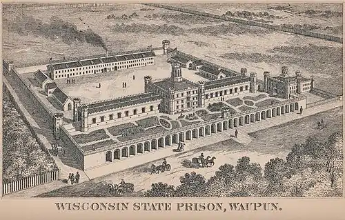 On July 4, 1851, Governor Nelson Dewey selected the Waupun area to be the site of the Wisconsin State Prison. A temporary structure opened in 1851. It could hold a maximum of 40 inmates, and was intended to be used only until the completion of a wing of the main prison. By December 31, 1852, 27 inmates were held there. The first permanent building was completed in 1854, and is still in use today as the South Cell Hall. According to the Commissioner of the State Prison, it was to be constructed of stone using prison labor.[4] Additions were made over the years in 1855, 1906, 1913, 1940, and 1998. The prison was added to the National Register of Historic Places as the "Wisconsin State Prison Historic District" in 1992.[5]