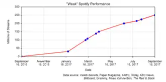 Between September 2016 and January 2017, "Weak" amassed 30 million streams,[16] later amassing over 70 million more streams in the next two months.[10] While climbing Billboard charts,[17] the band released a music video for "Weak" in March,[11] further pushing the song onto the Hot 100.[18] Metro named AJR their artist of the day on March 13, 2017.[19] After performing the song on Today in April,[20] the song was released to the radio for airplay and charted further.[21] The song's success additionally attracted the attention of Rivers Cuomo, frontman of rock band Weezer, who then collaborated with AJR to produce the song "Sober Up".[22] "Weak" had accumulated more than 250 million streams after a year of its release,[23] with Apple Music including "Weak" on its "Best Alt Songs of the 2010s" playlist.[24]