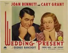 Wedding Present is a 1936 American romantic screwball comedy film directed by Richard Wallace and starring Joan Bennett, Cary Grant and George Bancroft. The screenplay was written by Joseph Anthony, based on a story by Paul Gallico. The film was distributed by Paramount Pictures. Producer B. P. Schulberg was the firm's former studio head. The film reteamed Bennett and Grant, despite the fact their previous pairing Big Brown Eyes had not been a commercial or critical success.[1]