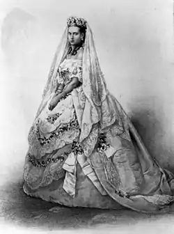 The wedding dress of Princess Alexandra of Denmark (the future Queen Alexandra) was worn at her wedding to Albert Edward, Prince of Wales (King Edward VII from 1901 to 1910) on 10 March 1863 in St George's Chapel, Windsor Castle. It was the first in British royal history to be photographed while being worn. The gown was made by London dressmaker Mrs James of Belgravia.[1] It is now part of the British Royal Collection. In 2011, the dress was part of a display of royal wedding dresses at Kensington Palace.[2]