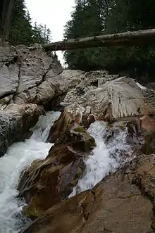 Weeks Falls is a waterfall on the south fork of the Snoqualmie River, located near North Bend, Washington, USA, just south of Interstate 90 at exit 38. The falls are at the end of the road that goes past the Olallie State Park ranger headquarters.[1] From the gravel parking lot, there is a paved accessible overlook to see the falls and a small area around the hydro-electric plant. There is also a ¼ mile accessible interpretive trail nearby.[2]
