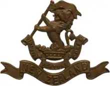 After the Samoa expeditionary force had been despatched, the New Zealand Government decided to form an infantry brigade of four battalions from the existing territorial regiments. Each infantry battalion was made up of four companies with each company being affiliated with one of the territorial regiments. As the 5th (Wellington) Regiment was already largely overseas, it was excluded from this process. The Wellington Infantry Regiment was therefore formed from the other regiments of the Wellington Military District, namely the 7th (Wellington West Coast), 9th (Hawke's Bay) Regiment, 11th Regiment (Taranaki Rifles), and 17th (Ruahine) Regiment.[14] Ironically the 5th (Wellington) Regiment was not affiliated with the Wellington Infantry Regiment and instead became affiliated with the New Zealand Rifle Brigade. Following the war, the Wellington Regiment inherited the black blaze insignia used by the New Zealand Rifle Brigade[15]
