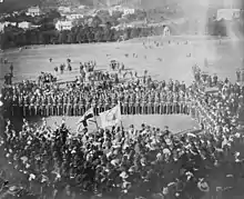 With the out break of the First World War in August 1914, the British Government requested for New Zealand to send a military force to capture the German colony of Samoa. The Samoa Expeditionary Force was dispatched on 15 August and consisted of around 1400 soldiers and nurses.[12] The 5th (Wellington) Regiment provided two infantry companies, for a total of 559 men, which was the largest contribution of any unit in the New Zealand Military Forces. 26 men from the regimental band also travelled with the expeditionary force. Samoa was occupied without incident and the occupation force was relieved in April 1915 by a smaller force of 360 personnel who were unfit for active service.[13]