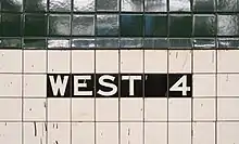 The walls of the station contain green-tile bands with green borders; since West 4th Street is an express station, it has a wider tile band than local stations.[64] The tile colors were designed to facilitate navigation for travelers going away from Lower Manhattan; on the Sixth and Eighth Avenue lines, the tiles change color at the next express station to the north. As such, the green tiles used at the West Fourth Street station were also used on local stations to the north on Sixth Avenue, 14th Street and 23rd Street. The next express stations on either line, 14th Street on the Eighth Avenue Line and 34th Street–Herald Square on Sixth Avenue, used a different tile color.[65][66] When the station was under construction, New York University (NYU) officials had requested that the station contain purple tile bands because that was NYU's official color. However, this was not done because it would not have fit with the color-coded tile system used on the rest of the IND.[15] Small tile captions reading "WEST 4" run below the trim lines at regular intervals. Hunter green I-beam columns run along all the platforms, alternating ones having the standard black station name plate; The signs read "West 4 Street", replacing the older signs which simply read "W4".