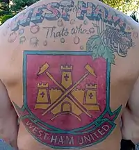 West Ham United F.C. supporters are the followers of the London-based West Ham United Football Club, who were founded as Thames Ironworks in 1895. There are 700,000 fans on the club's database and over 2,300,000 likes on Facebook.[1] The club's website is in the top ten most visited websites for English football clubs by people in the USA.[2] Their fans are also associated with a once-notorious hooligan element[3] and have long-standing rivalries with several other clubs, most notably Millwall.