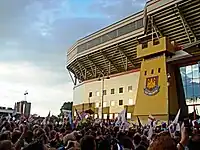 West Ham fans have taken part in pitch invasions and protests against the club's board of directors and their perceived financial mismanagement, after poor performances on the pitch or to show disapproval at the sale or purchase of players such as Lee Bowyer.[56][57][58] Other notable pitch invasions took place in the 1990s against West Ham's launch of The Hammer's Bond, a debenture which would have forced fans into the purchase of a bond before they could buy a season ticket.[57] In 1992, a post-match demonstration by fans against the scheme and new managing director, Peter Storrie, before a home game against Wimbledon was followed by pitch invasions in home games against Everton and Arsenal. The West Ham board of directors were influenced by the fans' protest and announced that the purchase of a bond would no longer be required in order to buy a season ticket.[59] Of 19,301 bonds originally available less than 1,000 were sold.[60]