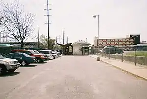In 1893, the Long Island Rail Road established a subsidiary that ran through West Hempstead between Valley Stream and Mineola called the New York Bay Extension Railroad Company which was merged into the LIRR nine years later. A low-cinder platform station was installed between Rockaway Road (today's Hempstead Avenue) and Fulton Street (now Hempstead Turnpike), which contained a bridge over the tracks and station for the New York and Long Island Traction Company trolleys. By 1926, the line was electrified with a substation built southeast of the current station site that remains to this day.[4] West Hempstead Station was rebuilt in 1928 on the north side of Hempstead Avenue and relocated onto the south side of the road on September 15, 1935. The 1935 station house ran directly along a loop driveway in front of Hempstead Avenue with a canopy leading from the back door to a second canopy along the platform of the tracks. Freight spurs and team tracks spread out just south of the station, some of which ended along the south side of Hempstead Avenue. The line initially extended north and connected with the current Hempstead Branch, leading to Mineola Station, and also contained a link to the Oyster Bay Branch. It was then cut back in 1959 to its current terminus of West Hempstead.[5] The site of the canopy along the tracks was replaced with the current brick structure, and the yards along the northwest side of the tracks were replaced by the Courtesy Hotel, which was torn down in 2011 and replaced by a group of apartment buildings.