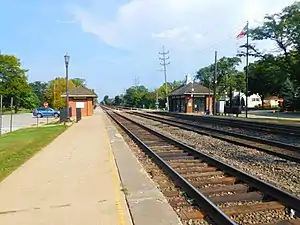 West Hinsdale is one of three stations on Metra's BNSF Line in Hinsdale, Illinois. The station is 17.8 miles (28.6 km) from Union Station, the eastern terminus of the line.[2] It is closed on weekends and holidays. In Metra's zone-based fare system, West Hinsdale is in zone D. As of 2018, West Hinsdale is the 143rd busiest of Metra's 236 non-downtown stations, with an average of 306 weekday boardings.[1] There is an unstaffed weather shelter used only during rush hour. The station is immediately adjacent to Stough Park in Hinsdale and is located 0.5 miles from downtown Clarendon Hills, Illinois.