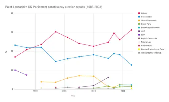 The seat's first member, Ken Hind, held the seat for two terms as a Conservative, winning the first election in the landslide Conservative result of 1983. In 1992 the seat was won by Colin Pickthall of the Labour Party, who was succeeded by Rosie Cooper in 2005. The 2010 result was more marginal, with a 9.0% majority, but was not within the 50 most narrowly won seats for Cooper's party.[6]