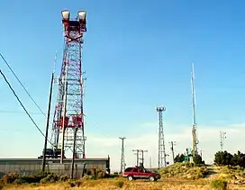 As well as radio stations, the mountain houses several cellular telephone transmitters providing service for AT&T Wireless, Verizon Wireless and T-Mobile. The mountain also contains towers for local emergency services, and state and federal government services.[3] An older tower, once operated by AT&T, is known more commonly as a "Long Line" tower, and was used for microwave communications is located on the north summit. It is the tallest tower on the mountain, and is the most predominant feature. With the invention of fiber optics, the use of these towers gradually declined, and other similar towers have fallen into disrepair.[4] This particular "long lines" tower, is connected to other towers in Riverton, Utah and Levan, Utah. A ham radio repeater, known as WA7FFM is located on the mountain as well.