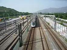 The West Rail line was served by 33 eight-car MTR SP1900 EMUs built by a Japanese consortium of Kinki Sharyo and Kawasaki Heavy Industries, of which 22 were originally ordered by KCRC as seven-car trains for the initial opening of the line (the same model was ordered in 12-car and 4-car variants for the East Rail and the original Ma On Shan line, respectively).[19] Up to 26 sets run during the morning peak service with a 171-second headway; MTRC specifies capacities of 52 seated and 286 standing passengers per car.[3] They were the only trains in use until March 2020, when a newly built eight-car East West line train, manufactured by CRRC Changchun Railway Vehicles, entered service on the line. Both of these models have a maximum running speed of 130 kilometres per hour (81 mph) and travel at an average speed of 56 kilometres per hour (35 mph) on the West Rail line. Unlike the trains on the East Rail line, there are no first-class compartments. All trains are serviced at Pat Heung depot and are equipped with the SelTrac IS moving block signalling system for train protection; this was among the earliest applications of the technology on a high-capacity, heavy-rail line worldwide.[20]