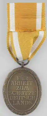 The medal was awarded in one class. It was struck in bronze. Its oval shape featured on the obverse (from bottom to top) a bunker, a crossed sword and shovel, and the German Eagle. The reverse bore the inscription "Für Arbeit zum Schutze Deutschlands" (For Work in the Defence of Germany).[3] Both sides of the medal were edged with a wreath of oak leaves. The medal was designed by Professor Richard Klein of Munich.
