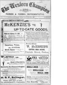 The town of Parkes had been served with many newspapers. The Western Champion began in 1893 and was published by M. J. Little.[1] The editor in the late 1890s was Gordon Tidy.