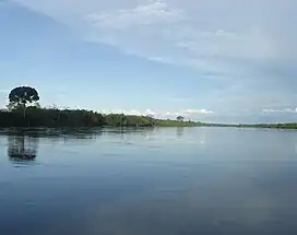 The Congo River separates this ecoregion from the Eastern Congolian swamp forests to the south. The river can be quite wide (up to 15 15 km) and braided through alluvial islands.[3] The swamp forest follows the tributaries of the Congo River, including the Likouala-Mossaka, Likouala-aux-Herbes, the Ubangi River (which is the main river flowing north-south through the center of the region before it meets the Congo), and the Kouyou River. To the northwest are the Northwest Congolian lowland forests, and to the east the Northeast Congolian lowland forests.[4]