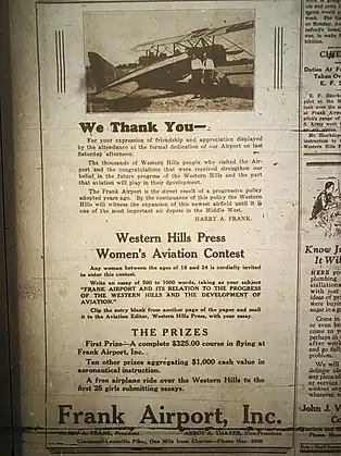 In the early months of the airport's life, the leadership ran "Women's Aviation Contests" in which women between the ages of 18 and 24 were invited to write an essay of 500 to 1000 words in length about "Frank Airport and its relation to the progress of the Western Hills and the development of aviation".[34] The first-place winner of the contest would win a $325 course in flying at Frank Airport.[34] Ten other prizes totaling $1,000 in value would be divided up in aeronautical instruction.[34] The first 25 women to submit their essays would be given a "free airplane ride over the Western Hills".[34][33] Essay judges were announced as:
