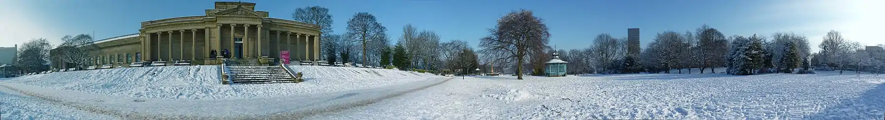 In 1895 the South West gates were erected on Western Bank close to the newly constructed Mappin Art Gallery. This became the park's main entrance and was built primarily so affluent visitors could drive their carriages right up to the gallery's door. The bandstand was added around 1900. It was designed by the Sheffield architects Flockton and Gibbs and constructed at a foundry in Glasgow. It was one of a pair, the other being placed in Hillsborough Park, but this has since been demolished. The bandstand was in use until the mid-1970s and many well-known bands have played there, including the Black Dyke Band and the Coldstream Guards Band; it has also staged several rock concerts there. The restored bandstand is now an approved Civil Wedding venue.[5]