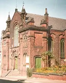 Following the building of the 1869 church, the original chapel on Main Road was used as a Sunday School. In 1896, this school building was lengthened and a three-storey extension added. The cost of the work was £650 but the new building was able to accommodate 500 scholars.[13] However, on 7 April 1906, the foundation stones were laid for a new Sunday School Hall on the site of the original chapel by Bishop C E Sutcliffe among others. The architect was C T Taylor Esq ARIBA. The cost of works was £1,850.[14] The fine Edwardian façade on Main Road is notable.