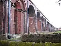 It was built between 1846 and 1850 under the engineering supervision of Terrence Wolfe Flanagan and formed part of the Bolton, Blackburn, Clitheroe and West Yorkshire Railway. It is a red brick arch structure and the longest and largest railway viaduct in Lancashire.[6] It carries the railway, now known as the Ribble Valley Line, 21.3m over the river for 620m.