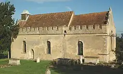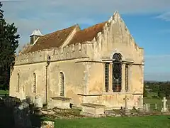 St. Andrew's contains several 17th and 18th century monuments to members of the successive manorial families, including one to John Rudge made in 1739 by the Flemish sculptor Peter Scheemakers.[3] The chancel includes 14th century stained glass showing the arms of the Whitfield family[3] and the west window of the nave has 18th century glass showing the arms of the Rudge,[3] Letten and other families.[2] The Venetian east window of the chancel has late Victorian stained glass by Morris & Co.[3] St. Andrew's has no tower; only a bell-turret. It has one bell, which was cast in 1636 by Ellis I Knight of Reading, Berkshire.[2] The church has no running water or electricity;[7] its only lighting is from candles mounted on 18th century brackets.[2] the church is a Grade I listed building.[8] In 1729, John Rudge presented a set of church plate to St. Andrew's. In Lord Charles Spencer's time the set was kept in Wheatfield Park for security, but this led to its being destroyed in the 1814 fire.[2] The present church plate is a replacement set that Lord Charles Spencer presented in 1814.[2] Past rectors include Henry Taylor, who was incumbent 1737–46.[2] St. Andrew's is now part of an extensive benefice with nine other parishes including those of Thame and Lewknor.[7]