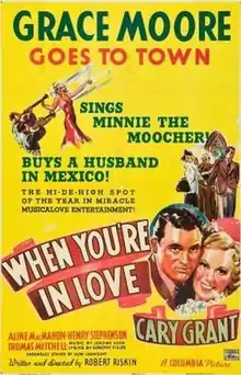 When You're in Love is a 1937 American musical film directed by Robert Riskin and Harry Lachman, who was not credited, and starring Grace Moore and Cary Grant. Moore sings "Minnie the Moocher" and the Ernesto Lecuona classic Cuban song "Siboney". Two of the other songs in the film "Our Song" and "The Whistling Boy" are by Jerome Kern and Dorothy Fields.