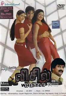 Whistle is a 2003 Indian Tamil-language slasher film directed by J. D.–Jerry, which is a remake of Urban Legend (1998).[1] The film stars debutant Vikramaditya, Gayathri Raguram, and Sherin alongside Vivek, Dhivyadarshini, Livingston, Bhanu Chander, Mayuri, and Vaishnavi, among others, in supporting roles. Although the film was an average grosser, its music, composed by D. Imman, became successful. Vivek's comedy track is based on Mel Gibson's act in What Women Want (2000).[2]