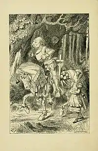 The White Knight is a fictional character in Lewis Carroll's 1871 book Through the Looking-Glass. He represents the chess piece of the same name. As imagined in John Tenniel's illustrations for the Alice stories, he is inspired by Albrecht Dürer's 1513 engraving "Knight, Death and the Devil."[1]