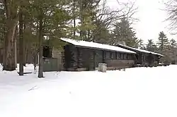 After the lodge was completed, it was decided to build a restaurant and breezeway onto the lodge building.[4] Logs for most of the project were shipped via railroad from as far away as Oregon and Washington state, unloaded in Stratford, Illinois and dragged to the construction site by teams of horses. The CCC project also completed sixteen[5] one room log cabins and three four-bedroom cabins. The work crews also built picnic shelters, trail shelters and foot bridges. Only the logs for the cabins came from another source.[4] They were purchased from a salvage company that had purchased utility poles from a defunct utility company at the price of 30 cents a piece.[4]