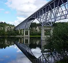 Whitehorse is located at kilometre 1,425 (Historic Mile 918) of the Alaska Highway and is framed by three nearby mountains: Grey Mountain to the east, Mount Sumanik to the northwest and Golden Horn Mountain to the south. The rapids which were the namesake of the city have disappeared under Miles Canyon and Schwatka Lake, formed by the construction of a hydroelectricity dam in 1958. Whitehorse is currently the 64th largest city in Canada by area. The city limits present a near rectangular shape orientated in a NW-SE direction.[23]