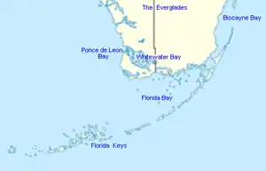 Whitewater Bay is an inlet of the Gulf of Mexico in southwestern Florida in the United States. The bay is located entirely within Monroe County north of Cape Sable in the Everglades National Park. Whitewater Bay leads into Oyster Bay to the west, then Ponce de Leon Bay in the Gulf of Mexico. Hells Bay is nearby.