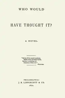 Who Would Have Thought It? (1872) is a semi-autobiographical novel written by María Ruiz de Burton.[1] After a long period in which Ruiz de Burton's work was almost completely unknown, the novel was rediscovered by critics interested in the history of Mexican-American literature, and republished to acclaim in 1995. Yet Ruiz de Burton's life was not particularly typical of the Mexican-American experience, as she married a prominent US officer, Captain Henry S. Burton, in the aftermath of the Mexican–American War and became acquainted with many powerful people in Washington D.C. The novel reflects her ambiguous position between the small in number Californio elite and the Anglo-American populace, which formed the majority of the United States population.