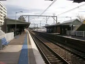 The station's original signal box, described as a "Type EO", was replaced with a "Type O" design signal box in 1966. Accessible from Station Street to the station's north, and through a metal staircase at the eastern end of Platform 2, the signal box was a two-storey high brick building, with a "terracotta tiled hipped roof and aluminium framed windows". The lower floor was primarily used for surveillance of the level crossing at Stewart Avenue, using a closed-circuit television link between the box and the level crossing.[8] A precast reinforced concrete footbridge crossed the tracks at the station's eastern end, allowing easy access for commuters between the platforms. The footbridge is relatively modern, having been built in 1992, with access between the platforms in the 56 years previous only existing through the station's entrances on Beresford Street and Station Street, respectively.[8]