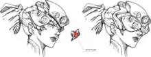 Once work began on Overwatch, she was one of the first four characters implemented into the game, utilizing the character Tracer's model textured solid black as a placeholder.[1] Several concepts were considered, with a primary focus on her visor to have multiple red "bug" eyes and changing her outfit to a revealing bodysuit with spiked heels. The developers noticed the lenses resembled a spider's eyes, and they chose to emphasize an arachnid theme on her design,[2] changing her into the character Widowmaker.[1] Several approaches to her design were considered during this time, including various degrees of chitin-like armor as well as the possibility of a segmented stinger-like grappling hook that coiled around her arm. Her visor also went through several iterations, many of which covered her entire upper head, before switching to an idea of having her face exposed while the helmet was integrated into her head with cables out of the back making up her hair.[2] They finally settled on a design drawn by Roman Kenney where she retained her hair, and the visor was made up of pieces that automatically extend over her eyes when used.[2]