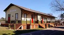 By the end of the 20th century, the Wiggins depot had fallen into a state of disrepair and was being used only for storage and as periodic office space by railroad personnel. Out of 14 G&SIRR depots built, the Wiggins depot was the only one still standing between Gulfport and Hattiesburg.[10][11] KCS agreed to donate the depot to the City of Wiggins with the stipulation that it be moved off railroad property.[12] Mississippi Department of Archives and History designated the depot a Mississippi Landmark on April 6, 1999, and issued a permit to the City of Wiggins for relocation and restoration of the structure with the intent of housing community activities, tourism functions, and offices for economic development.[13]