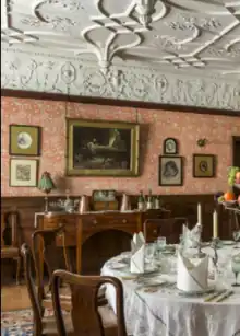 Wightwick was built by Theodore Mander, of the Mander family, who were successful 19th-century industrialists in the area (Mander Brothers), and his wife Flora, daughter of Henry Nicholas Paint, member of Parliament in Canada. It was designed by Edward Ould of Liverpool in two phases; the first was completed in 1887 and the house was extended with the Great Parlour wing in 1893.[1] The elaborate pendant imitation Jacobean plaster ceiling was designed by Leonard Shuffrey.[2] Notes taken by Theodore Mander at a lecture given in Wolverhampton in 1884 by Oscar Wilde on the 'House Beautiful' inspired Wightwick's interiors. Taking inspiration from this lecture, Theodore and his wife Flora decorated its interiors with the designs of William Morris and his Arts and Crafts contemporaries. However, the Pre-Raphaelite collection was mostly assembled after the house was donated to the National Trust, particularly by Geoffrey Mander and his second wife, Rosalie, who was an art historian.