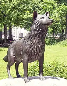 Coyotes historically did not inhabit the northeast United States. They were first seen in New York State in the 1940s, in Westchester County in the 1970s, and first sighted in the Bronx in the late 1990s.[11] Stable breeding populations were established in three parks in the Bronx by approximately 2012.[11] The first documented sightings were in February 1995, when two dead females were found. The first had been struck and killed by a vehicle on the Major Deagan Expressway, and the second was found in Van Cortlandt Park a week later, having been shot.[12] It is believed that a third individual was in the adjacent Woodlawn Cemetery in October 1994.[13] A commemorative bronze statue, named Major, was erected in 1998 in Van Cortlandt Park.[12][14][13] Coyotes typically inhabit a 2 sq mi (5.2 km2) territory, and will travel 3–10 mi (5–16 km) in a day.[15]