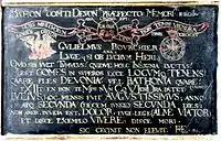 On the base of his monument appears a cryptic tablet. It comprises separate elements of anagram, chronogram and epigram. Top: Bathon(i)ae Com(i)ti Devonae praefecto memoriae ergo ("To the memory of the Earl of Bath therefore to the prefect (i.e. Lord Lieutenant) of Devon"). Beneath this line is in the centre an inscribed skull and cross-bones, with to its left the image of a phoenix rising from a fire above which is Morior Orior ("I am dead, I shall arise") above which is inscribed on a scroll the well-known Roman epithet: Mors mihi lucrum ("Death to me is reward"). On the right side of the skull is an image of a circular dial inscribed around the circumference with the first two letters of the 12 months of the year. The top-most month, which is crowned, is IV i.e. JU for July, the month of his death. Above is inscribed: Finis Coronat ("the end crowns"), above which is inscribed on a scroll the French motto of Bourchier: Bon temps viendra ("The right time will come"). Within the skull is written on the top line grama, to which word three other words point from above the skull, ana-, chrono- and epi- (all Greek words in Latin form). These denote to the reader the presence of anagrams, chronograms, epigrams and other puzzles within the tablet. In the skull below the word grama are the two Latin words se and pul, and on the two bones which intersect behind the skull are written 4 more Latin words: ad, in, tum, and crum, which may all be combined together to form the sentences: in sepulcrum ad sepultum ("into the grave in order to be buried") or in sepultum ad se pulcrum ("in the act of burial one's-self (is made) beautiful"). Below is the anagram, on the top line the words Gulielmus Bourchier ("William Bourchier"), below which is the indicator ana-: and the name's Latin anagram Luge (si ob lucrum heri) ("mourn if on account of the profit of yesterday"). Below is a Latin epigram with some words in capitals, which may relate to a chronogram or other word-game: Quid sibi vult tumulus quidve haec insignia luctus est comes in superos ecce locumo tenens quare fles Devonia vel Bathonia quare ("If you wish to know what is this pile or why this great mourning, the Earl behold is above as place-holder (lieutenant), as weeps Devon and Bath"). Below is a chronogram: "eXIIt en bon teMps nVnCo VIenDra patet" (exiit en bon temps nunc (o?) viendra patet) a mixture of limited sense in Latin and the French motto of Bourchier, meaning "he went in good time now he shall come he seeks". When the capital Roman numerals are added together individually they make 1,623, the year of his death. Underneath is a further possibly cryptic epigram, with some words in capitals: Julius hoc mensis fuit Augustissimus anno atq(ue) secunda decem junge secunda dies non amor invidia est dolor euge lege alme viator et disce exemplo vivere: disce more sic cecivit (cecidit?) not elevit, translated as "The month of July was the most august in this year and the following day...is hatred not love, well-done! read O Traveller and teach by (his) example (how ) to live: teach (how) to die, thus he has fallen he has not arisen". At the end are two monograms: "R...E" and "AR".