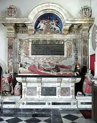 A magnificent[7] and sumptuous[8] monument exists in St Peter's Church, Tawstock, incorporating recumbent effigies of William Bourchier, 3rd Earl of Bath and his wife Elizabeth Russell. It was restored in 1999 by Lawrence and Sue Kelland, mainly to replace the iron bands within the alabaster which threatened to rust and thereby expand to crack the stone. The iron was replaced with stainless steel and the monument was repainted.[9] Kneeling to the left is their adult son and an infant child, whilst on the right kneels their adult daughter with a recumbent infant at her side. Two vines grow up on either side of the main effigies, on the dexter inhabited with heraldic escutcheons showing five generations of ancestry described by five shields of Bourchier impaling the arms of their wives. On the sinister vine are shown five similar escutcheons describing the ancestry of Elizabeth Russell over five generations as follows, from ground upwards:[10]