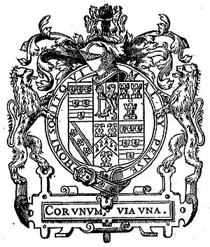 Cecil House was built as his London residence, an expansion of an existing building.[lower-alpha 1] Queen Elizabeth I supped with him there, in July 1561, "before my house was fully finished", Cecil recorded in his diary, calling the place "my rude new cottage."[34] Inherited by his elder son, Thomas Cecil, 1st Earl of Exeter, it was known as "Exeter House".