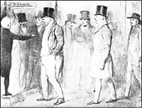 William Cobbett (left foreground), John Gully (middle) and Joseph Pease (right) (the first Quaker elected to Parliament) arriving at Westminster, during March 1833. Sketch by John Doyle.