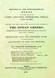 - ↑ Goodisson W., 1822, A Historical and Topographical Essay upon the Islands of Corfù, Leucadia, Cephalonia, Ithaca, and Zante: with Remarks upon the Character, Manners, and Customs of the Ionian Greeks; Descriptions of the scenery and remains of antiquity discovered therein, and reflections upon the Cyclopean ruins, London, 1822.