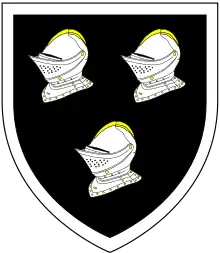 Shortly before his death in 1624, William obtained a grant of arms from the College of Arms. The arms were: Sable, three helmets argent a bordure of the last, i.e. a black shield displaying three silver helmets all within a silver border. The crest was a demi-lion guardant holding an anchor. This crest serves as the footrest of the effigy of Margaret Hungerford at Farleigh Castle. These arms bear close resemblance to those granted in 1605 to his cousin Sir Leonard Holliday, Lord Mayor of London in 1605:[8] Sable, three close helmets argent garnished or within a bordure engrailed of the second (Guillim, Display of Heraldry[9]), the differences being in the garnishing of the helmets, the form and tincture of the bordure and (for the crest) the direction in which the lion faces.[10] The pedigree in the 1663 Heraldic Visitation of Middlesex, of "Holliday of Bromley", starting with Sir Leonard Holliday, makes no mention of William Holliday.