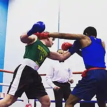 ![]() Hughes (left) landing a blow in February 2018 | |