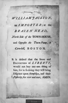 William Jackson (1731-1810)[1] was a Revolutionary era loyalist born in Boston. He inherited and then owned a general store called "The Brazen Head." The store was located in Cornhill, an area in the center of Boston.[2] Because of his loyalty to the crown, Jackson made enemies with many patriotic Bostonians, and was the target of frequent intimidation by the Sons of Liberty.
