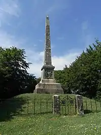 - Hatherleigh: in 1860 funded by public subscription an obelisk made from ashlar granite[39] was erected near Fishleigh on the north edge of Hatherleigh Moor in Devon, on a site with a spectacular view southwards towards Dartmoor.[40] On its base is a bronze relief sculpture by Edward Bowring Stephens inscribed BALAKLAVA, showing the wounded Morris being carried by three soldiers.[41] The decorative iron gates in front of the monument show the following inscription on two escutcheons: