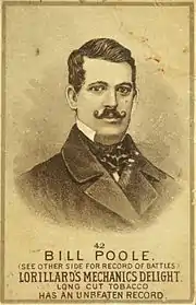 William Poole was a large man for the time. He weighed over two hundred pounds and was about six feet tall. He was known for his brutal boxing style: "He was well known as being a notoriously dirty fighter, not averse to biting off noses, gouging out eyeballs, or beating a man to jelly."[3] He fought in many fights that were considered illegal due to the brutality of bare-knuckle boxing. He was also a known skilled knife fighter, as a result of his profession as a butcher. Poole was a known gambler and a heavy drinker. He closed his family's butchery business in the 1850s and opened a drinking saloon, known as the "Bank Exchange".[3]
