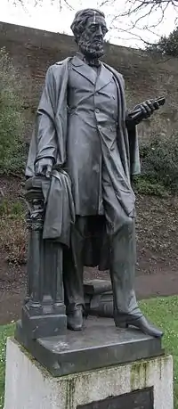 A bronze statue was made of the Earl by the Exeter sculptor Edward Bowring Stephens[5] and in October 1880 [6] was erected at the front of the central garden in Bedford Circus, Exeter, on the spot where Stephens' "The Deer Stalker" had formerly stood. (The latter statue now stands near the Earl's statue, both having been re-located in Northernhay Gardens). The unveiling ceremony was attended by Sir Stafford Northcote (1818-1887), later Lord Lieutenant of Devon 1886–7, (whose own statue in Northernhay Gardens now stands nearby) with the Mayor and Corporation, other dignitaries and the Earl himself. The statue was paid for by public subscription to the Devon Statue Fund, which had attracted 1,300 signatories for this work. A banquet was held following the unveiling ceremony. The plinth is of Cornish granite from the Cheesewring Quarries, on the rear of which a bronze plaque is affixed inscribed with verse from Wordsworth's Happy Warrior: