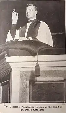 Sinclair was ordained in 1876. His first post was as assistant minister at the Quebec Chapel, Marylebone after which he was resident chaplain to the Bishop of London. He was appointed vicar of St Stephen's, Westminster in 1880 and Archdeacon of London in 1889.[2] In 1892 he succeeded Walter Purton as editor of the Churchman, filling the post until 1901, when he was succeeded by Augustus Robert Buckland.[3]